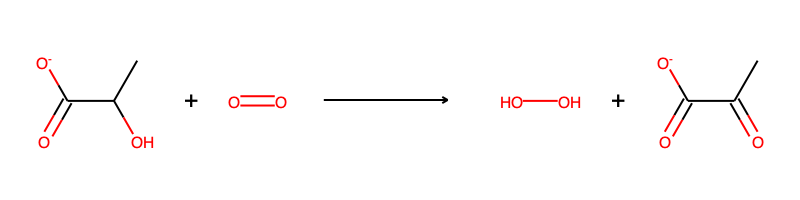 [H:1][O:2][C:3]([H:4])([C:5](=[O:6])[O-:7])[C:8]([H:9])([H:10])[H:11].[O:12]=[O:13]>>[O:2]=[C:3]([C:5](=[O:6])[O-:7])[C:8]([H:9])([H:10])[H:11].[H:1][O:12][O:13][H:4]
