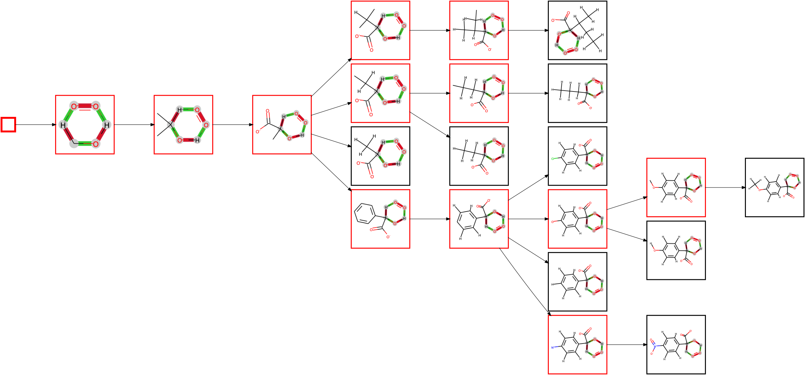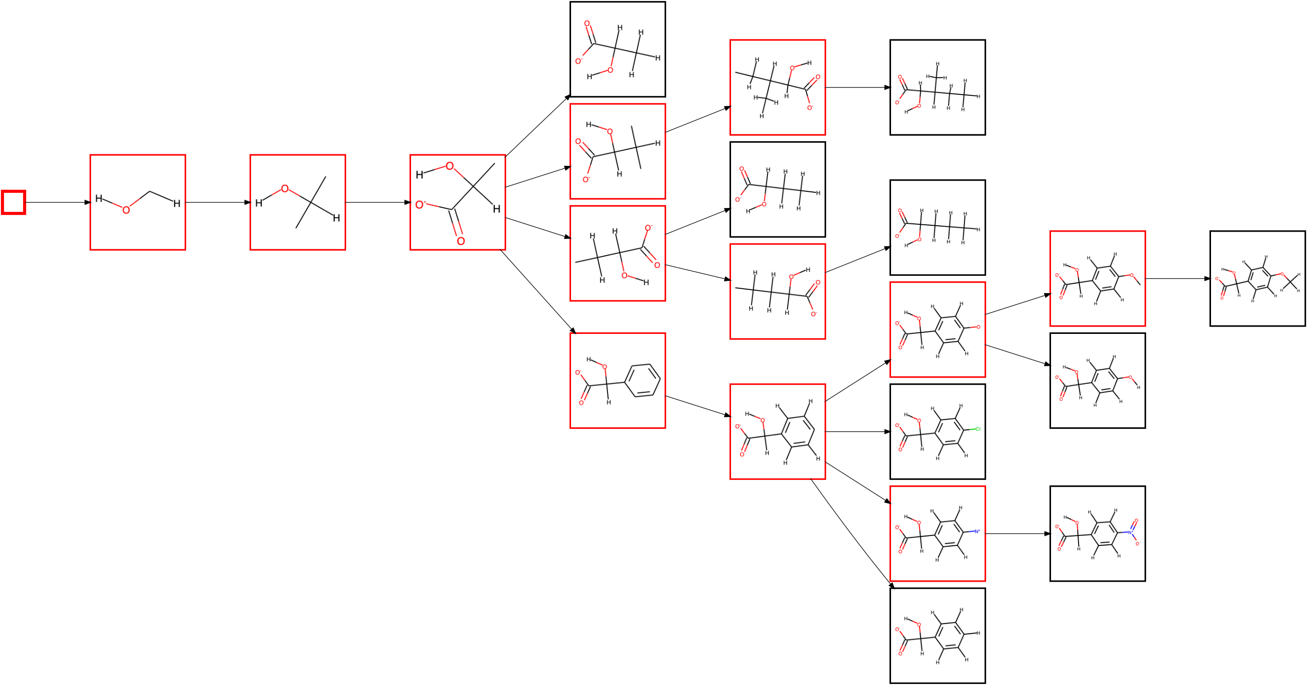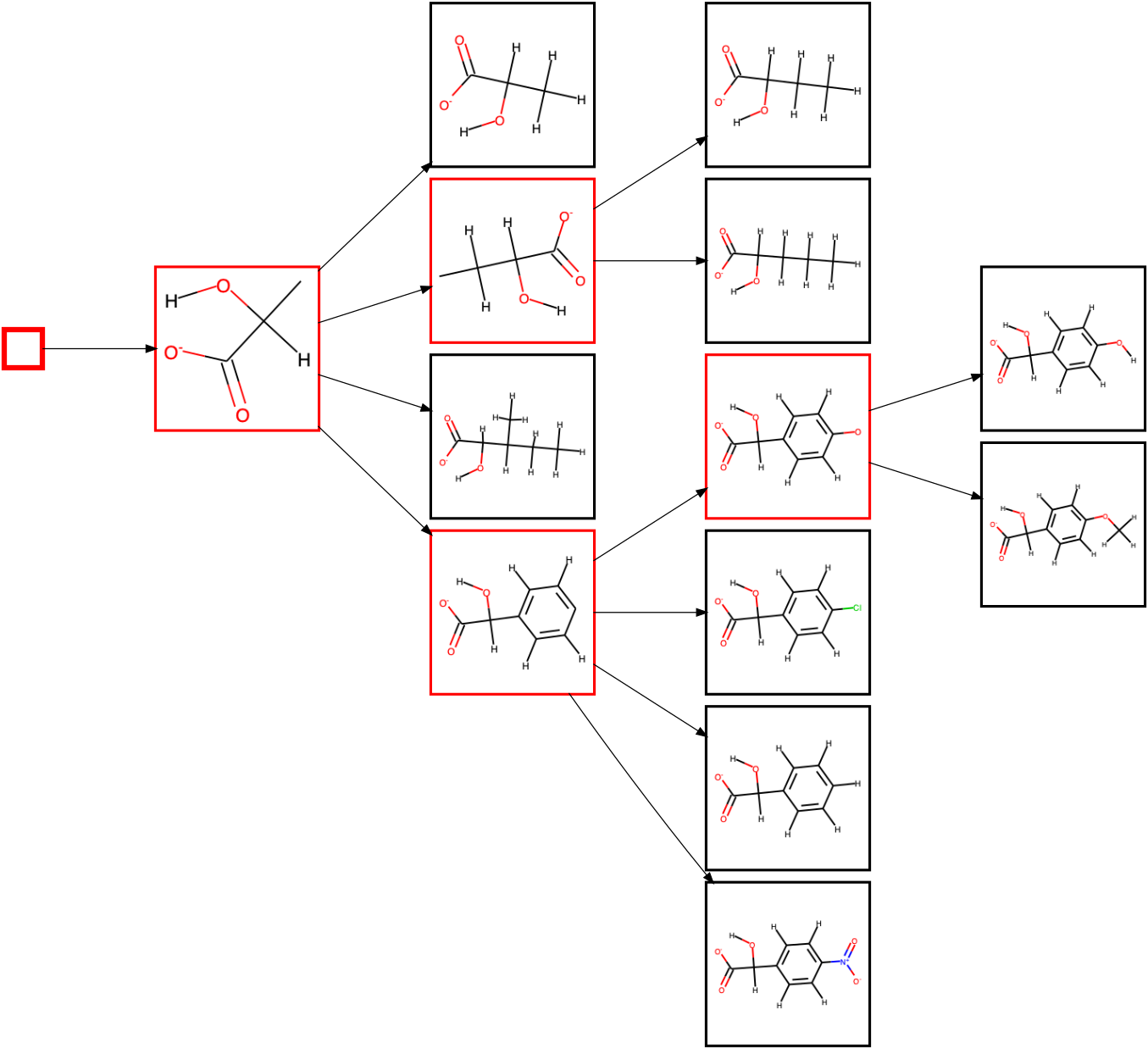 Substructures/fragments are shown in red, and full molecules in black (which are always leaf nodes). The first node is the seed itself. Since the alcohol is always secondary in the known substrates of L-lactate oxidase, the next node shows the rule extended to include the two neighbouring carbon atoms. There are now two possible atoms to extend the rule further, but only of of them, namely adding the oxygens of the carboxylate group, is applicable to all substrates, so that this extension is made first. The diagram then splits up in branches as it extends the rule at the other carbon atom, with either only hydrogens attached, a linear chain, a branched chain or an aromatic ring.