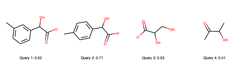 we see that query 2 scores very high because it follows all the patterns we have outline before (hydroxyl group at secondary carbon next to carboxyl group, if an aromatic sidechain is present it is always para-substituted). Furthermore, it is very similar to some of the known substrates. The second best score is achieved by query 3, which has still all of the common substructures (hydroxyl group at secondary carbon next to carboxyl group) but has a lower similarity with the known substrates. Query 1 is rather similar to the known substrates, but is meta-substituted in the aromatic ring, which causes a penalty in the scoring function (the template it fits to in the Hasse diagram has no immediate leaf nodes). Query 4 is missing the carboxyl group, causing a large penalty, too. In fact, query 2 and 3 are known to be processed by lactate oxidase according to BRENDA, the other two were made up for the course of this tutorial, which query 4 being expected to be worse than query 1. The scoring thus depicts our confidence in lactate oxidase being able to oxidize the query substrates quite well.